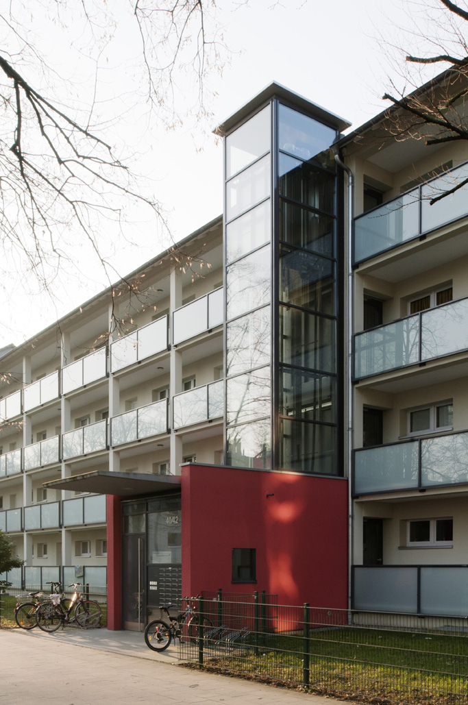 Im bewohnten Zustand wurden die Laubengänge saniert, neue Eingangssituatuionen mit Aufzügen geschaffen, Balkonanlagen ergänzt und die Fassade gestaltet.